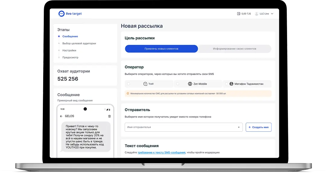 В Таджикистане SMS читают почти все — даже без интернета и смартфона. Вы получаете доступ к аудитории в Душанбе, Худжанде и самых удалённых регионах одновременно.
